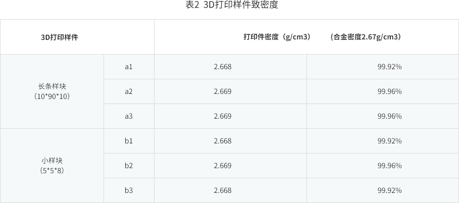 采用排水法對(duì)3D打印樣件進(jìn)行致密度測(cè)試。利用高流動(dòng)性鋁合金粉末打印的不同大小樣件密度差異小、均一性好。