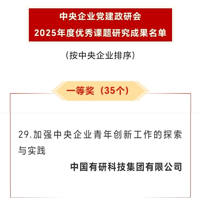 近日,中央企業黨建政研會2025年度優秀課題研究成果評選結果公布,中國有研研究課題——《加強中央企業青年創新工作的探索與實踐》榮獲一等獎。