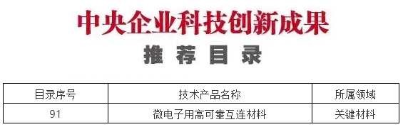 5月30日,在第5個“全國科技工作者日”到來之際,國務院國資委向全社會發布《中央企業科技創新成果推薦目錄(2020年版)》(以下簡稱《目錄》),我公司技術產品“微電子用高可靠互連材料”入選在內。目錄序號91號。