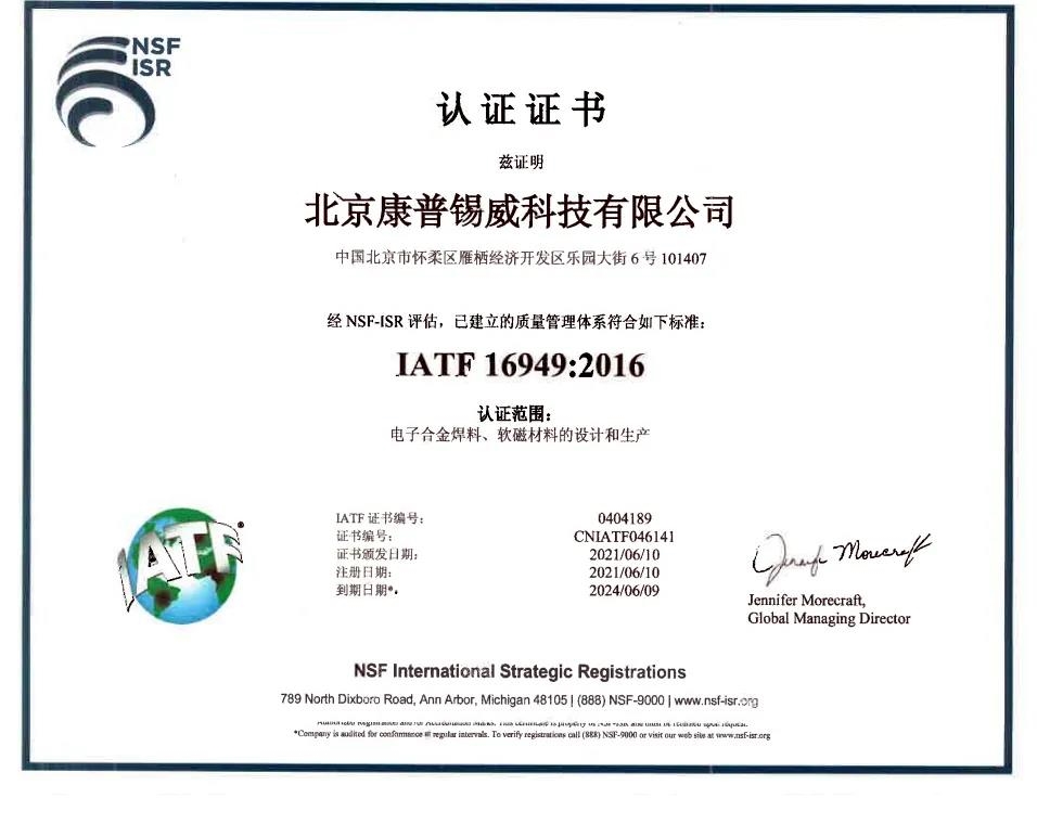 北京康普錫威科技有限公司順利通過了江蘇艾凱艾國際標(biāo)準(zhǔn)認(rèn)證有限公司關(guān)于IATF 16949:2016質(zhì)量管理體系的認(rèn)證和審核,并于2021年6月16日獲得了IATF 16949:2016質(zhì)量管理體系認(rèn)證證書。