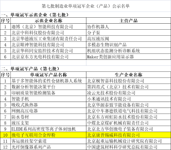 近日,由工業和信息化部、中國工業經濟聯合會組織開展的第七批制造業單項冠軍企業(產品)培育遴選工作已完成相關審核并公示獲評企業名單,康普錫威研發的微電子互連用合金焊粉被評選為“國家制造業單項冠軍產品”。