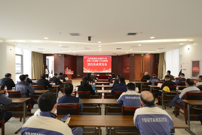 11月7日,全國機械冶金建材行業勞模創新工作室聯盟暨中國有研“工匠+”聯盟簽約及成果發布會在中國有研燕郊基地召開。本次活動以“產研融合創新,助力戰新產業”為主題,由機械冶金建材工會指導,中國有研承辦。機械冶金建材工會二級巡視員李曉強蒞臨指導,鞍山鋼鐵鞍鋼股份黨委副書記、工會主席趙忠民,中國建材泰山玻纖全國勞模溫廣勇等行業聯盟單位代表通過線上線下方式參會。中國有研黨委委員、紀委書記唐學智出席活動并講話,工會常務副主席葉松芳主持活動。