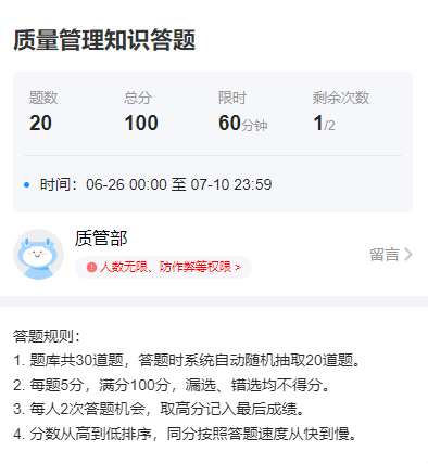 本次知識競賽采取線上答題方式,競賽組包括一線部門和管理部門組,按參與人數(shù)的前20%取一、二、三等獎,獨立評定。